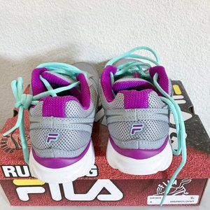From the pavement to the treadmill, you'll love wearing these women's FILA high-performance running shoes. In gray/purple/mint.