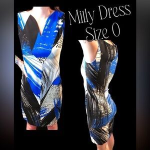 FITTED MINI DRESS SZ 0 BY MILLY @SACKS 5TH AVE BLUE BLK WHITE BRUSH DESIGN TO FLATTER FIGURE&CATCH THE ATTENTION OF EVERY EYE DIRECTLY TO YOU! THIS IS A STATEMENT PIECE-A WORK OF ART-A WALKING PICASSO! THIS STUNNING DRESS RETAILS AT SACKS FOR $595!!