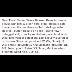 🌺NEW FLORAL FLUTTER SLEEVE BLOUSE, M🌺 This is a re-Posh. It’s beautiful, but never worn. I purchased this from a lovely boutique @foxarazzi, check her out. Unfortunately, it was too small for me in the bust. I’m a 36D for reference. I'm happy to provide additional photos, and answer any questions you may have. Thank you for visiting my closet.🌺Heather