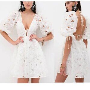 This dress is SO pretty! Dress features a gorgeous embroidered semi sheer organza with intricate 3-D dimensional floral patterns, a plunging v-cut neckline, and tie string detail front and back! LOVE the dreamy flattering silhouette! Perfect for any special occasion.
