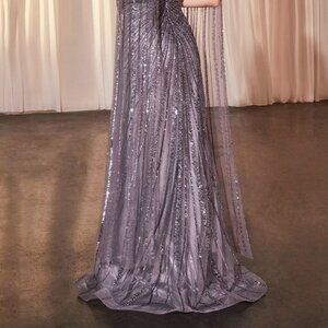 Dazzle and captivate in our elegant Long Length Tulle Sequin Gown in the gorgeous shade of English Violet. The V-neckline adds a touch of allure, while the sheath silhouette accentuates your curves in all the right places. Crafted with delicate tulle fabric that floats and moves with grace, this dress is designed to make you feel like a modern-day princess.