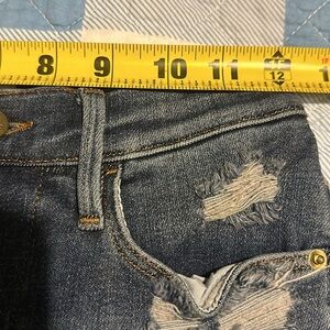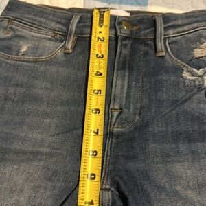 fly with button closure, five-pocket silhouette Contrast stitching, gold-tone logo hardware, belt loops Faded, distressed, ripped at knee Skinny-leg silhouette FRAME uses a mix of post-consumer recycled materials and pre-consumer environmentally-safe fabrics to ensure the production of eco-friendly products. Made in Turkey