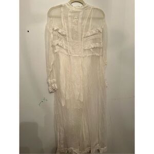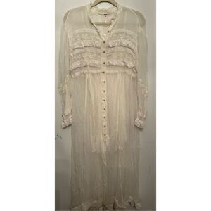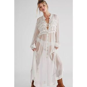 Just as versatile as it is vintage-inspired, this forever timeless maxi dress is featured in a button-front, sheer design with lace-adorned, ruffle detailing throughout for an added special touch.