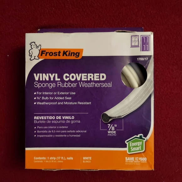 BRAND NEW IN BOX FROST KING WHITE VINYL COVERED SPONGE RUBBER WEATHER SEAL ⅜ BULB FOR EXTRA SEAL ⅞" WIDE 17FT LONG STRIP WITH NAILS MODEL 1700/17 ENERGY SMART FOR INTERIOR OR EXTERIOR USE WATERPROOF AND MOISTURE RESISTANT