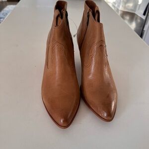 BRAND NEW women’s brown leather Frye boots. Side zipper, pointed toe, western style, embossed logo. Women’s size 10.