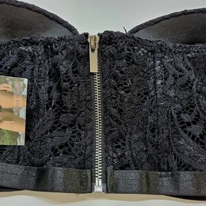 Fantasy Lingerie Midnight Garden lace bustier long line bra top. Underwire molded cups and V-front for a flattering fit. Exposed zipper back close. Can be worn as a bra or crop top. Panty not included. Style FL2906.