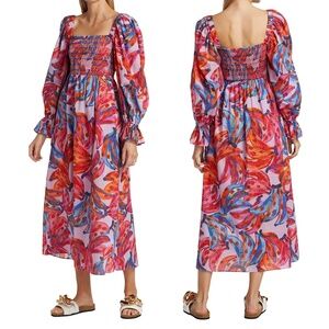 - Stretchy smocked bodice, square neck and back, elastic shoulders, long sleeves with elastic cuffs with beaded tassel ties, skirt lined