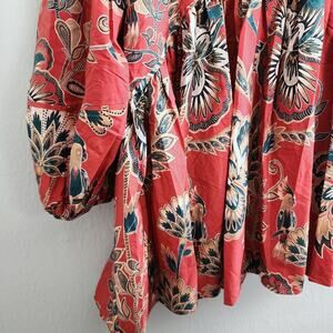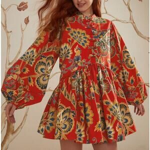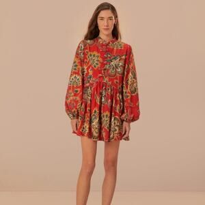 Farm Rio Mini Dress, Red Floral Print, Long Sleeve Dress, Balloon Sleeve Puff Sleeve, High Neck, Cinched Waist, Whimsical Boho Style, Tropical Vacation Resort Wear, 100% Cotton