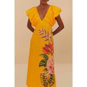Featuring a playful V neckline and flowing ruffled sleeves, this dress showcases a lush botanical print, blooming vividly across the rich fabric.