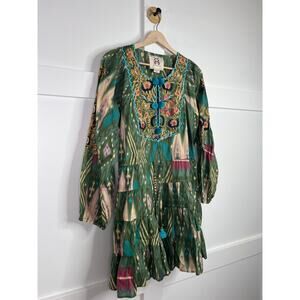 Figue Josie Embroidered Short Bohemian Pom Pom Long Sleeve Green Mini Dress. New without tag!