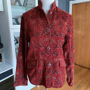 New with tag (no price tag), brownish-red tapestry front pocket blazer, front four button closure, comes with an extra button, size small petite, no visible flaws