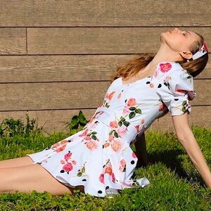 This whimsical and romantic dress features a mixed floral and polka dot print! It’s designed with a figure-skimming shape for an effortlessly flattering fit. It has a sweetheart neckline and a cut out back panel with a zipper closure and a top button fastening. Pretty puff sleeves, pleated details throughout the skirt, and an optional belt. Fully lined. True to size: model is wearing a small: Bust: 34”/ Waist: 25”