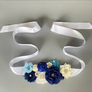 NEW Floral maternity sash belt, for baby shower, blues/white, crystals/pearls