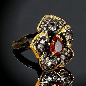 NEW Flower Cocktail Ring Sz.8 14K Black Gold Over S925 Silver Orchid Glam Fairy