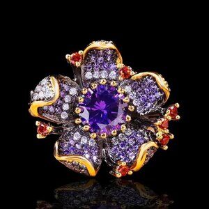 This spectacular cocktail ring features a captivating design of a flower paved with purple & clear cubic zirconia. Large purple round cut natural zircon in the center of the flower. This unique ring is perfect for special occasions.