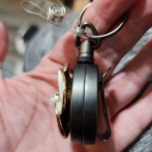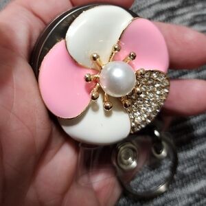 NEW Flower Pink White Enamel Rhinestone Badge Name Tag ID Clip Nurse Medical Job