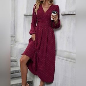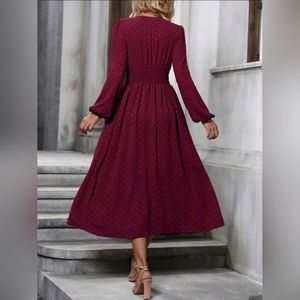 NEW Flowy Swiss Dot Ruched Waist Lantern Sleeve Dress Burgundy Red