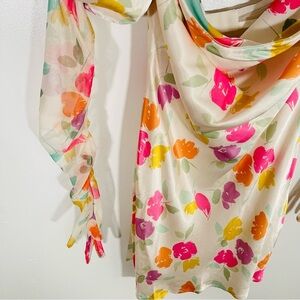 Description: Tossed floral satin mini dress with strapless neckline and detachable sleeves with gloves in a printed mesh. Strapless neckline. Does not include necktie. Cowl bak with tie. Partially lined.