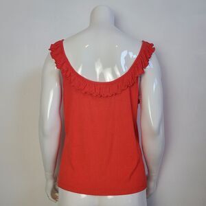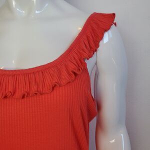NWT Forever 21 plus size pink ribbed tank top with ruffled neckline. Color is kind of a cross between a salmon pink and an orangish red.