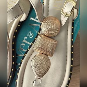 Light beige/cream with gold embellishments on top, gold studs all around footbed, and gold buckle