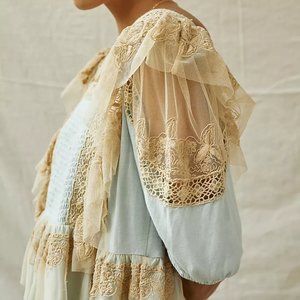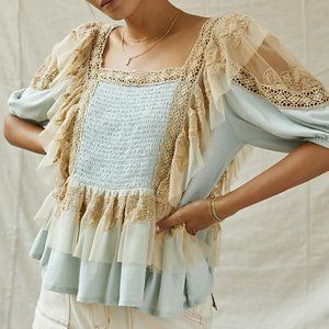 Label = Conversion US S = US 4 - 6 Decadent ruffles and elegantly embroidered lace infuse this blouse with charm that's fit for a fairy tale. Cotton fabric See through mesh fabric Faux cold shoulder Gathered angel ruffles Lace applique trim, neckline, sleeves Smocked bodice detail Puffed short sleeves Square neck Peplum style with layered gathered tiers About 22.5" hip length Pullover closure Light/pastel blue/mint hued base Beige/light brown/egg shell trim & details Imported Style No. 4112344600015 Hand wash Forever That Girl - Feminine aesthetics meet bohemian magic with the contemporary womenswear brand Forever That Girl, creating perfectly wearable, everyday pieces. Art, Individualism, Diversity, Sustainability, Hand Crafted, Inclusion, Environment, Fair Manufacturing, Recycling conscious brand. Featured at Anthropologie Product listings may have inaccuracies. Please send a message for any product inquiries.