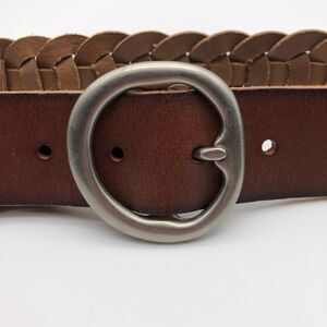 The NEW Fossil Leather Belt in women's size small is a stylish and versatile accessory that features a woven design in gold, brown, and red colors. The braided belt adds a touch of bohemian flair to any outfit, making it perfect for a variety of occasions from festivals to casual outings. Made of high-quality leather with stainless steel hardware, this belt is both durable and fashionable, adding a timeless touch to your wardrobe with a blend of classic and modern elements.
