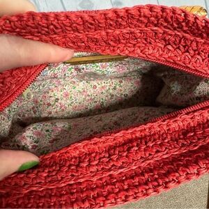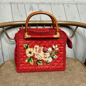 Fossil vintage red woven wicker straw embroidered bamboo handle tote bag new