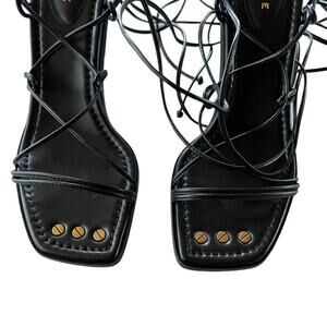 The ultimate barely-there sandal with a bohemian spirit, this lace-up silhouette features a stacked heel and squared toe with hand-screwed accents and contrast stitching. Crafted from supple Italian leather, dress it up or down any day of the week with denim, dresses, suiting, and beyond.