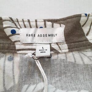 NEW Free Assembly Rayon Linen Wrap Skirt. Size: Large. Rayon/linen blend. Machine wash. Color: Brown with a slight green undertone with white leaf print and blue dots. Skirt is a wrap skirt with two buttons inside waist for adjustment on right side and tie on left side. Pockets at side seams. Deep pockets! Material has a nice weight to it.