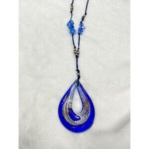 Features a striking blue glass teardrop pendant with silver and metallic flake design inside