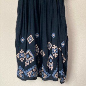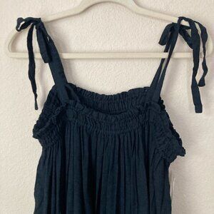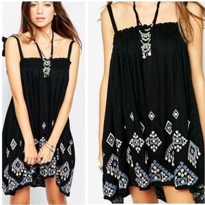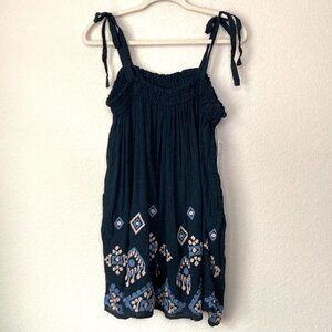 Free People Black Tunic Dress with shoulder strap ties and embroidered trim.