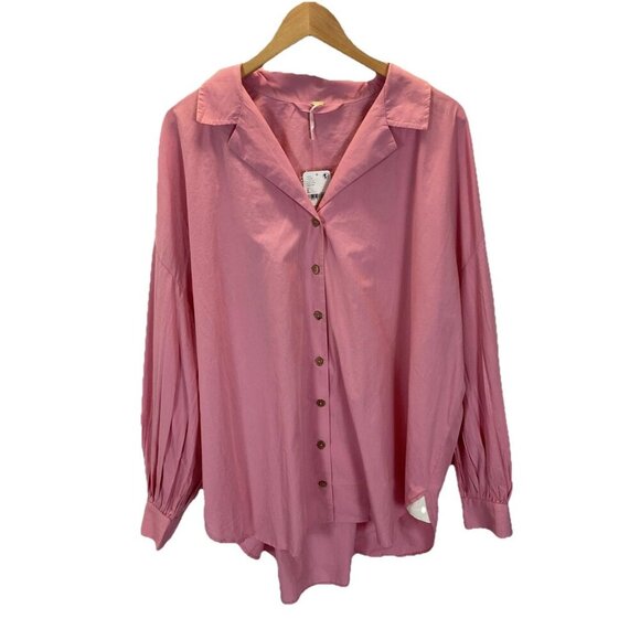 NEW Free People Button Down Lantern Sleeve Poplin Shirt Pink Oversized size L