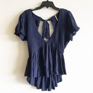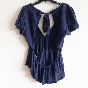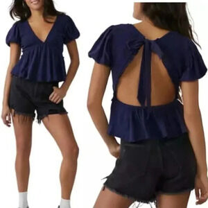 NEW Free People Charlotte Open Back V-Neck Peplum Blouse Navy Blue, Size XL