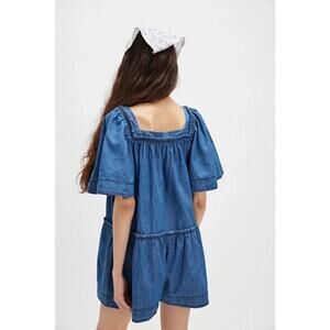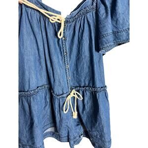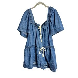 Features: Square neckline, button-front detailing, soft denim fabrication, tie features throughout, flutter sleeves, pull-on style, side pockets