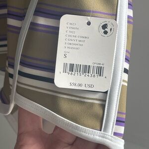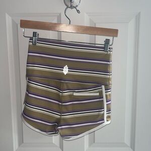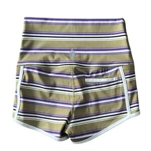 These Free People Movement Island Time Shorts are designed for women in size small and feature a striped pattern in dune combo olive and purple colors. The high-rise hot pants have an elastic waist for a slim fit, with an inseam of 2.5 inches.