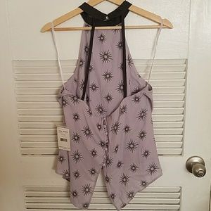 Brand new with tags. Size small. Pretty lavender colour with dark grey print. Halter Top, buttons up the back.