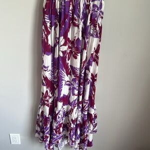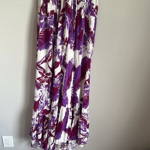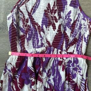 Features: - Red purple white combo - Tropical floral palm print - Smocked stretch fit bodice - Adjustable racerback straps - Straight square neckline - Pleated waist - Pullover style - Flounced handkerchief hem - Midi/maxi length depending on height - 100% Viscose - Machine wash cold