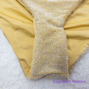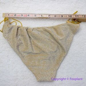 Keep it super sunny and bright . . . just like you babe! This string-style pant is lined, featured in metallic gold lurex fabrication and offers cheeky to medium coverage with thin adjustable ties at the hips. Gather in or flatten out at the waist to provide mid coverage to Brazilian depending on your mood! Pairs perfectly with the triangle bikini top in gold lurex (pictured, sold separately).