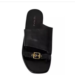Sure to be your go-to sandal all season long, this staple shoe is featured in a classic, slip-on silhouette and luxe leather fabrication with defined buckle detailing for an added special touch.