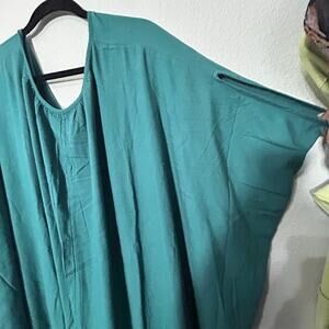Features: Boat neckline, draped dolman sleeves, banded hemlines, back button closure