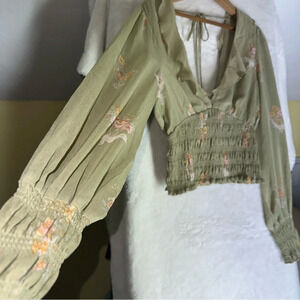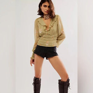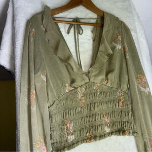 New Free People Smocked So Nice Top Green Floral Ruffle Blouse Feminine