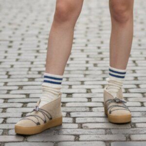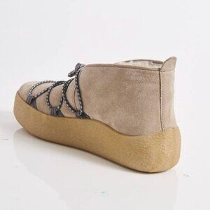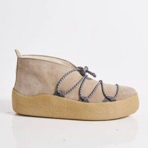 Features: Slip-on style, low-ankle length, suede uppers, shearling lining, bungee laces with adjustable toggle, platform crepe rubber sole