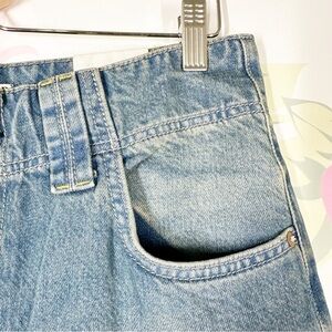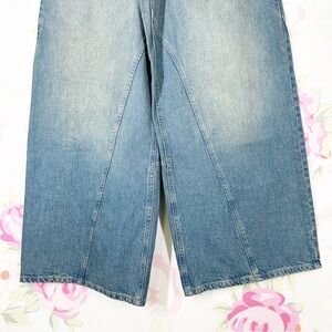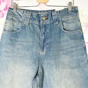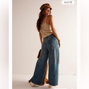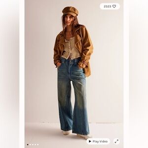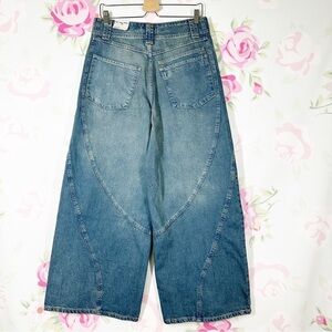 By We The Free. Stylish and cool. Mid rise. Slouchy wide leg silhouette. Zipper fly with button closure. Five pocket design. Work wear inspired seaming. Rigid denim fabrication.