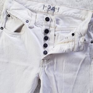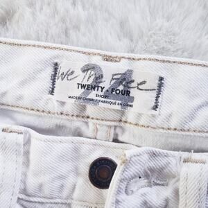 The perfect Summer jean in all white, high waisted, hi rise with exposed button closure. Raw cutoff frayed hem.