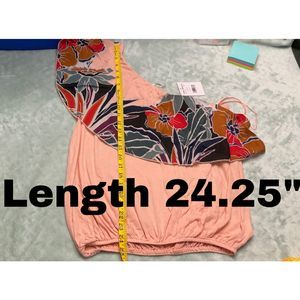 You’ll love this Annka Bubble Top from Free People. It has a great boho vibe. It features peach burnout jersey knit with a touch of lightweight linen, green/red/orange/blue/purple/black woven floral print flounce and an elasticized one-shoulder neckline and hem.