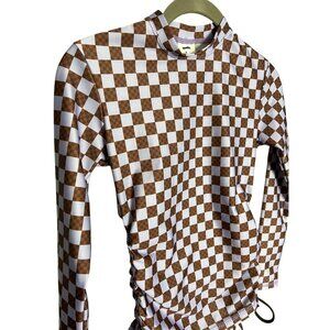 Checkerboard, check print, purple, ruched, cinched, fitted, long sleeve swim, surf top, swim top