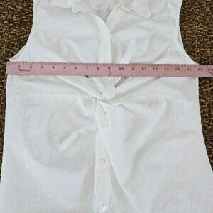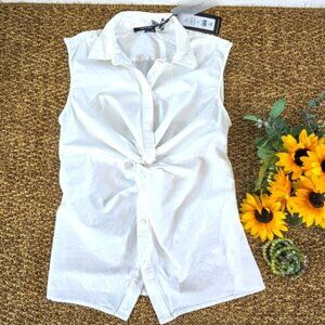 Elegant white sleeveless button-up top with a stylish twist front design. Perfect for casual or special occasions.