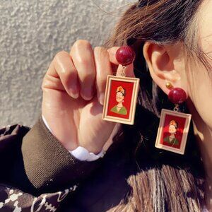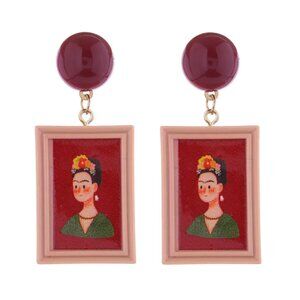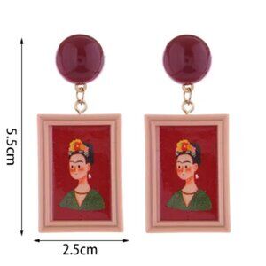 NEW Frida Kahlo Framed Portrait Red Drop Earrings Mexican Artist