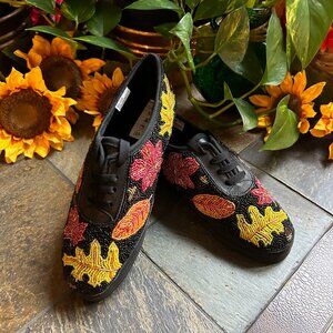 Colorworks fully-beaded black lace-up oxfords with colorful autumn leaves in size 7 medium.