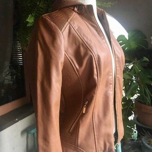 NEW! G by GUESS~Women Size Medium~Faux-Leather Moto Bomber Biker Jacket~Soft Hood Rib Panels~Copper Caramel Brown.